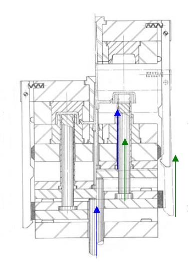 ขั้นตอนการปลดชิ้นงานออกจากแม่พิมพ์ เริ่มจากในภาพที่ 1 ซ้าย แสดงช่วงเวลาที่แม่พิมพ์เปิดออกเพื่อปลดชิ้นงาน ejector pin และ sliding sleeve จะถูกดันขึ้นพร้อมกันโดยมีชิ้นงานติดไปด้วย แรงที่ใช้ในการขับเคลื่อนนี้ได้มาจากจังหวะการเปิดแม่พิมพ์ของเครื่องฉีดพลาสติก โดยกลไกการขับเคลื่อนนี้จะถูกติดตั้งไว้ที่ด้านข้างของแม่พิมพ์ ภาพที่ 2 ภาพตัดด้านซ้ายแสดงจังหวะที่แม่พิมพ์ปิด ส่วนภาพตัดด้านขวาเป็นตำแหน่งเมื่อแม่พิมพ์เปิด